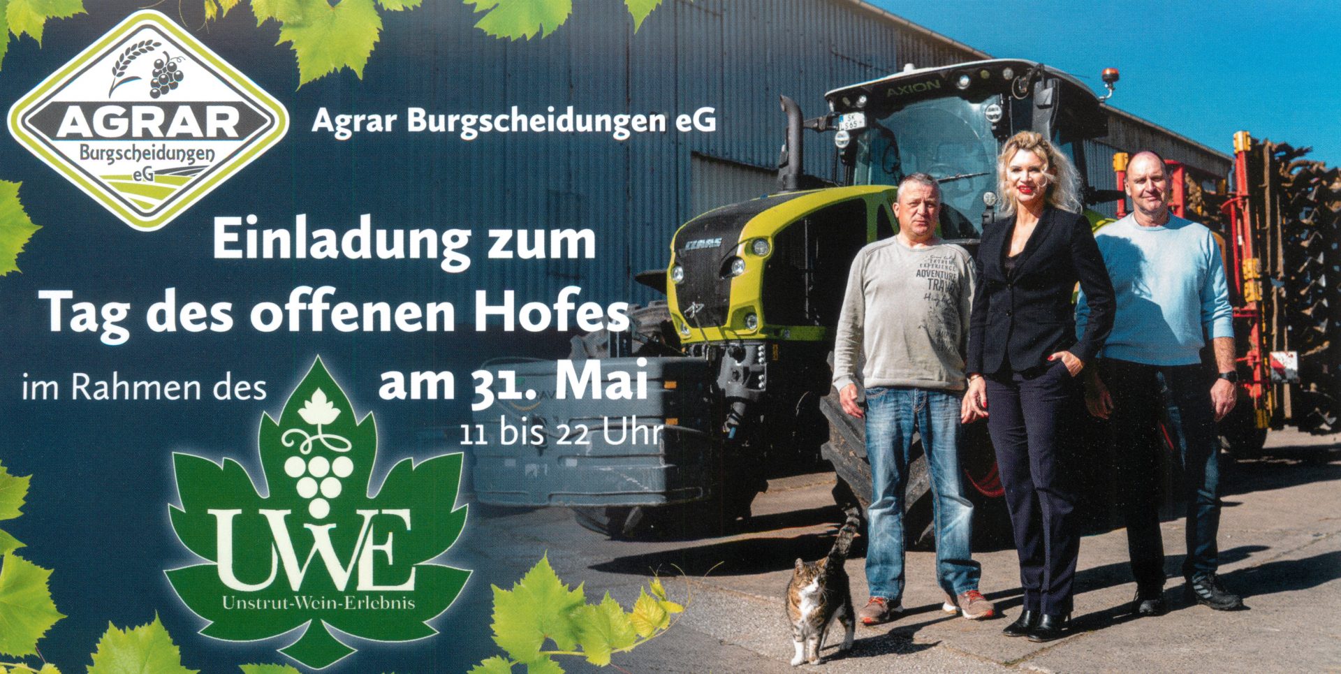 Am 11. Mai 2024 ab 10:00 Uhr laden wir herzlich zum „Tag des offenen Hofes“ im Rahmen des „Unstrut Wein Erlebnis / UWE“ ein!